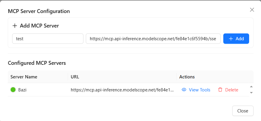 - Enter the server name and URL (currently only SSE protocol is supported)