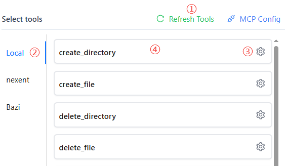 - On the "Select Tools" tab, click "MCP Config" to configure MCP servers in the popup and view configured servers