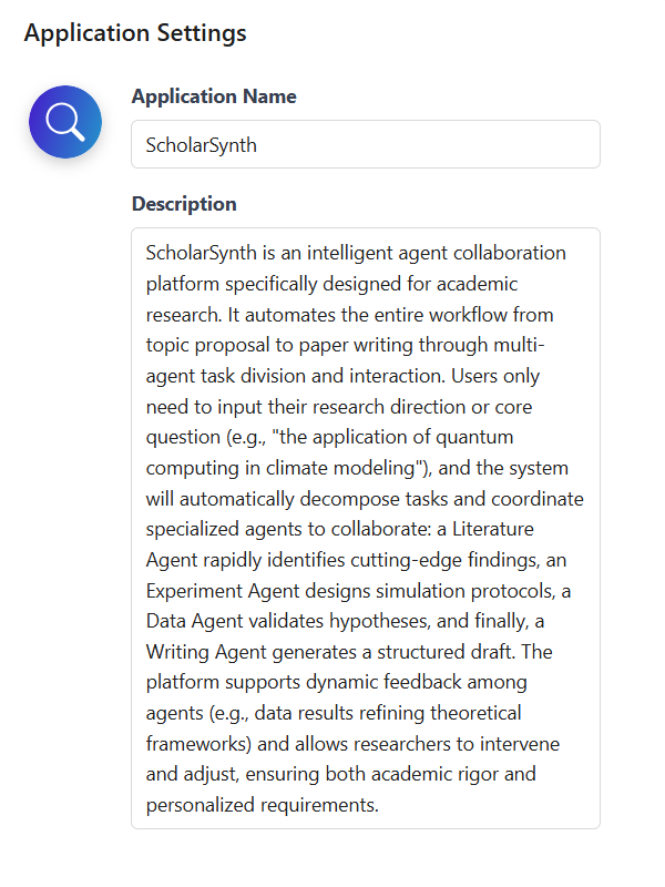 - The app description is provided to the model as background information when generating agents, enhancing the model’s understanding of the application scenario.