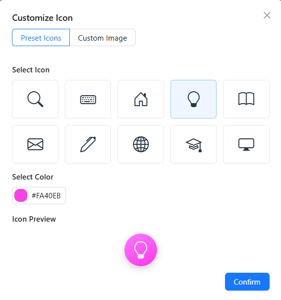 - Use a preset icon: Select from the built-in icon library, choose an image and background color for quick setup.