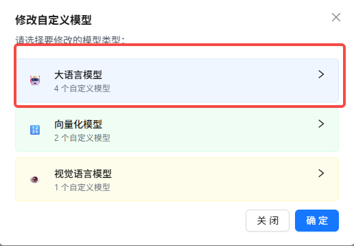 - 选择要修改或删除的模型类型(大语言模型/向量化模型/视觉语言模型)。