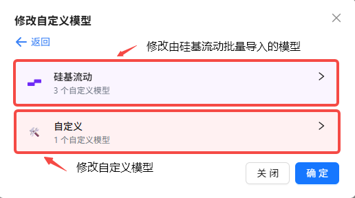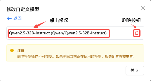 - 如果是修改单例自定义模型,点击删除按钮 🗑️ ,即可删除目标模型;想要修改相关配置,点击模型名称,即可弹出修改弹窗进行修改。
