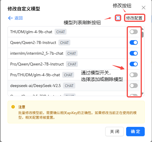 - 如果批量修改模型,可以通过启动或关闭模型开关,添加或删除模型。您可以通过点击右上角的"修改配置"按钮,对选中的模型进行批量的配置修改。
