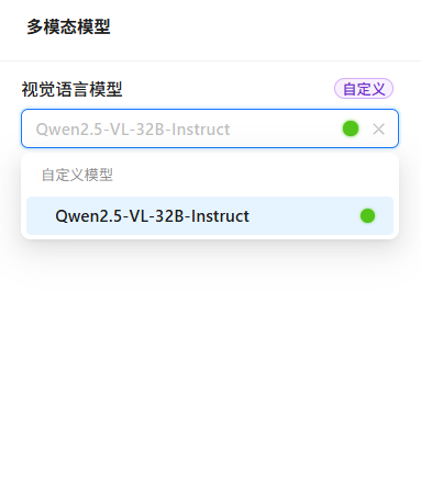 - 点击视觉语言模型下拉框,从已添加的视觉语言模型中选择一个。
